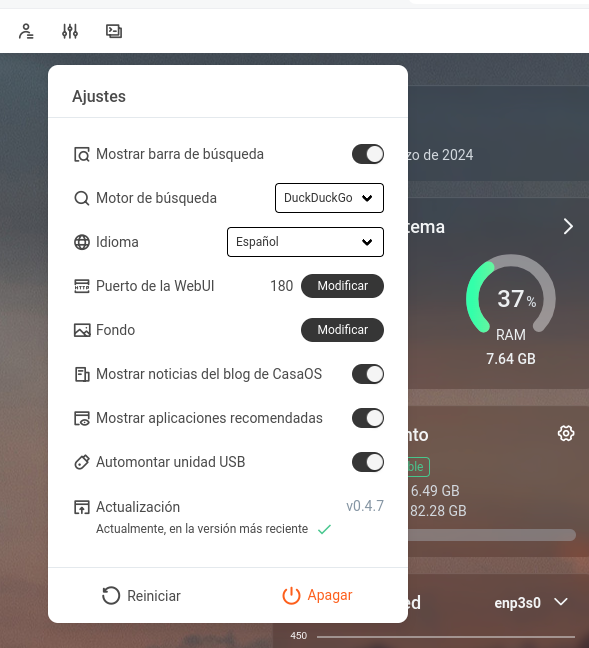 Básicamente en CasaOS, lo primero que hice fue sacar CasaOS del puerto 80, así liberarlo para el proxy reverso. para eso fui a los ajustes (el que tiene el icono como un ecualizador), y cambié el "Language" a Español, el "Puerto de la WebUI" a 180... puede ser realmente cualquiera menos el 80 y 443 que queremos dejar libres.