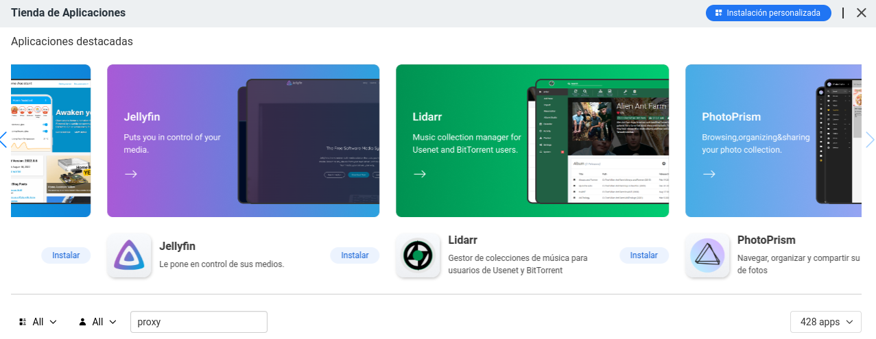 Luego, instalé un "Nginx proxy manager". Para eso hice click en la "App Store" y en el buscador puse "proxy".