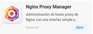 Luego puse "instalar" en el botón de "Nginx proxy manager" (en el mio dice Abrir porque ya está instalado). Desde allí, se puede dirigir la configuración de cualquier servicio web que se instale desde el interior de nuestro "servidor" hacia Internet, por ejemplo, yo instalé ghost, que es este blog, el cual desde "Nginx proxy manager" lo apunto así: